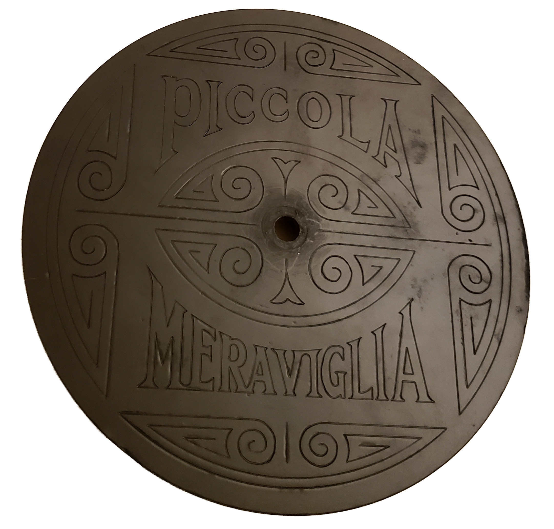 The other edition of this first volume had features that were consistent with volumes two through nine: -The records were now 6-inches, had pink-and-maroon Piccola Meraviglia labels, were renumbered in a "BY" series, and had a stunning design etched on the back (see left). -Perhaps this edition reflects a decision by Columbia to stop producing an Italian series of Little Wonder records and start producing a series called Piccola Meraviglia (see below).