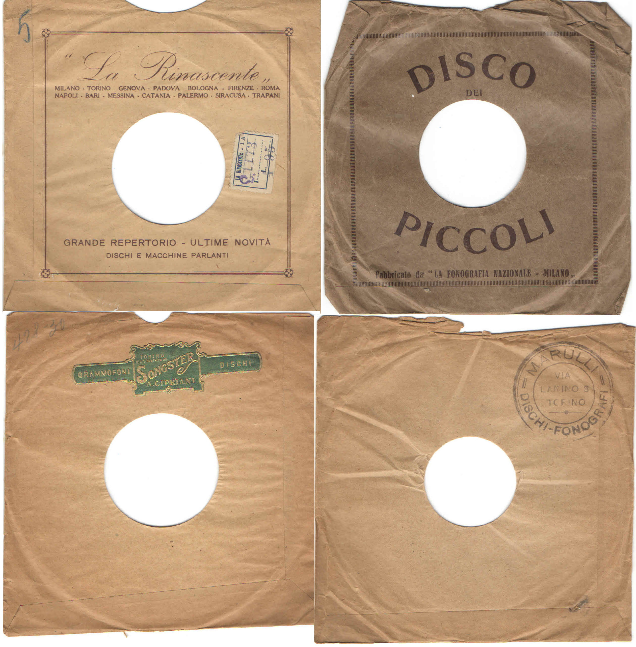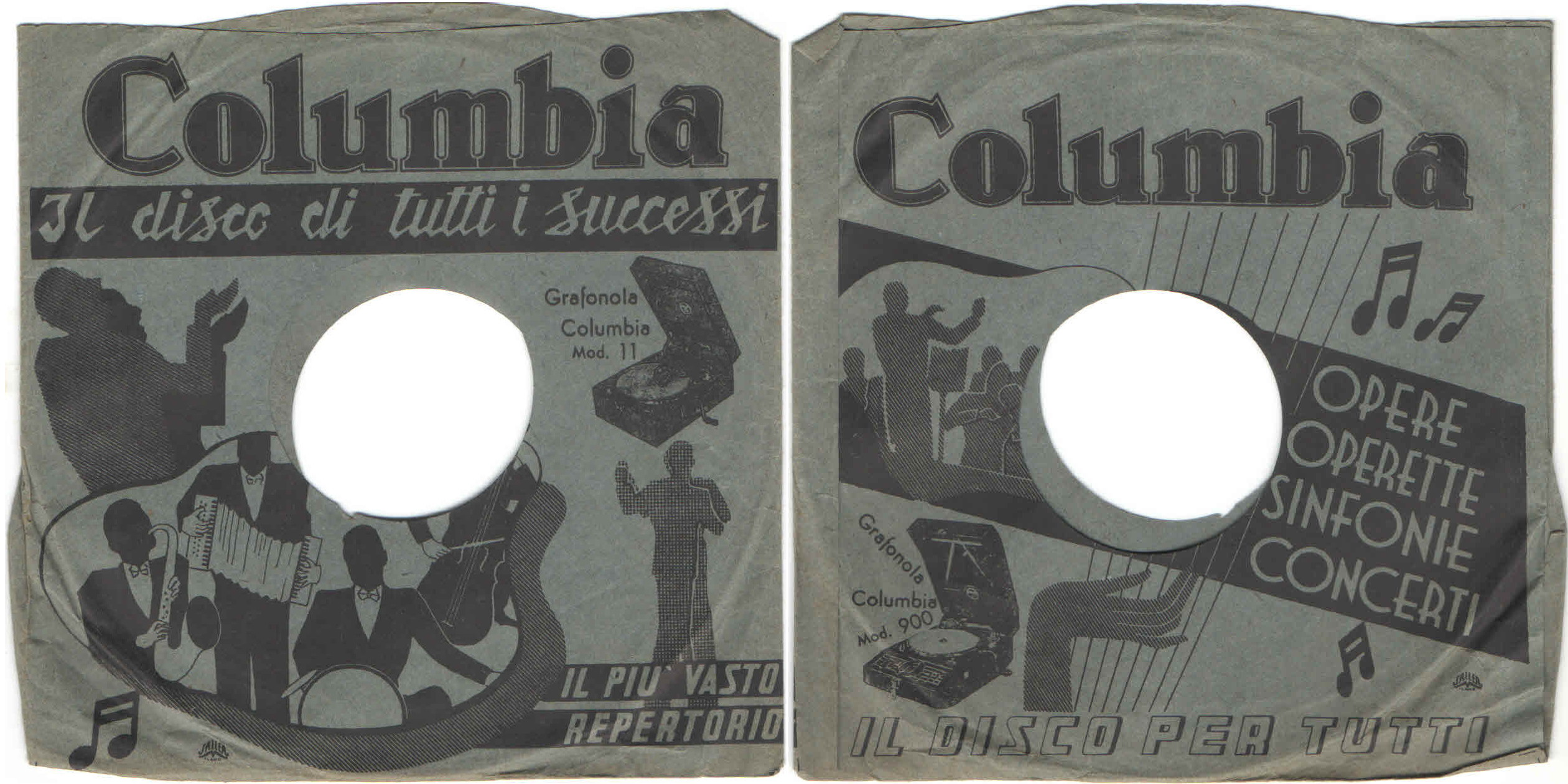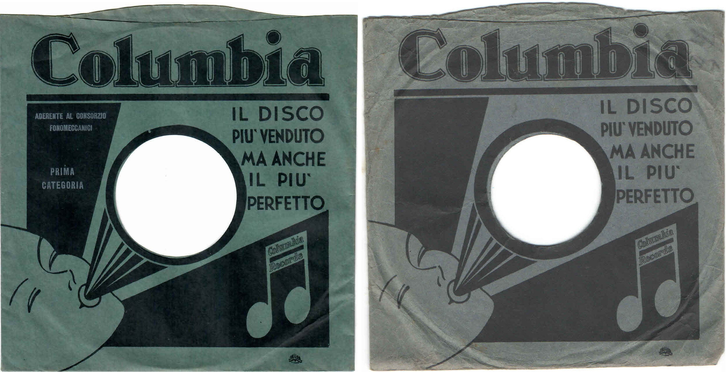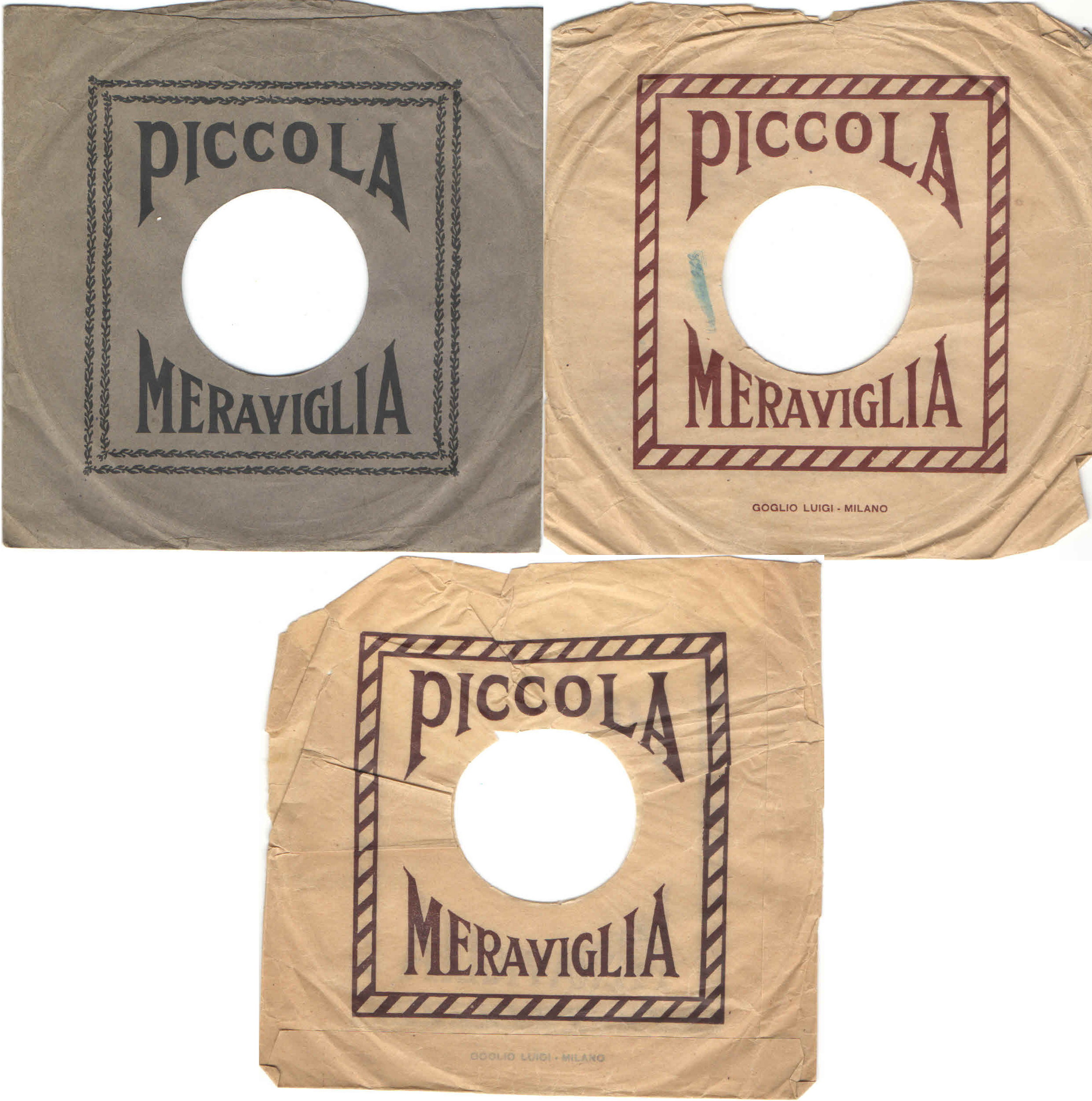 At some time in the late 1920s, Columbia started producing Piccola Meraviglia records separate from Libri Che Canta -- the first catalogue I have that lists these records is from 1928. -These were priced at 7 lire when launched, 6 lire in 1930, 4 lire in 1936 (a larger price drop also reflected in a lower price for Libri Che Canta that year), and 5 lire from 1938 on (my 1937 catalogue does not give prices; see the Advertisements page for all of the advertisements and catalogues I have found that include these books and records). -These were double-sided and numbered in a "PM" series. -The earliest have the pink-and-maroon labels and later ones (and likely re-issues of earlier ones) have a maroon label. -And, as near as I can tell, these were sold in sleeves, some from Piccola Meraviglia and others from dealers (see examples at left).