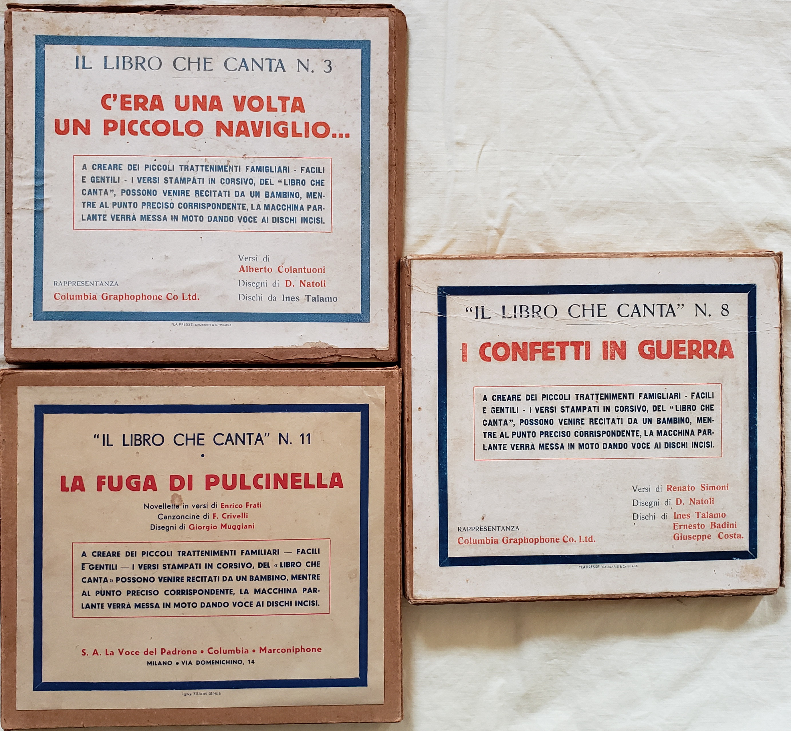 Starting sometime around 1923, just as Columbia was winding down Little Wonder records and the Bubble Book series (which was moving into the hands of Victor), Columbia launched a children’s book series in Italy, Libri Che Canta, which translates to "Books that Sing," the tagline for the Bubble Books. -The books don’t have any date or copyright information and so dating has relied on advertisements and catalogues. -As far as I can tell, the series grew to include twelve volumes (see the Discography page for complete details about each volume and the records each contain). -It’s quite likely the books were sold in boxes (see left) – I have three – and it’s possible the records in the books were in sleeves (see left) – I have several that came that way.