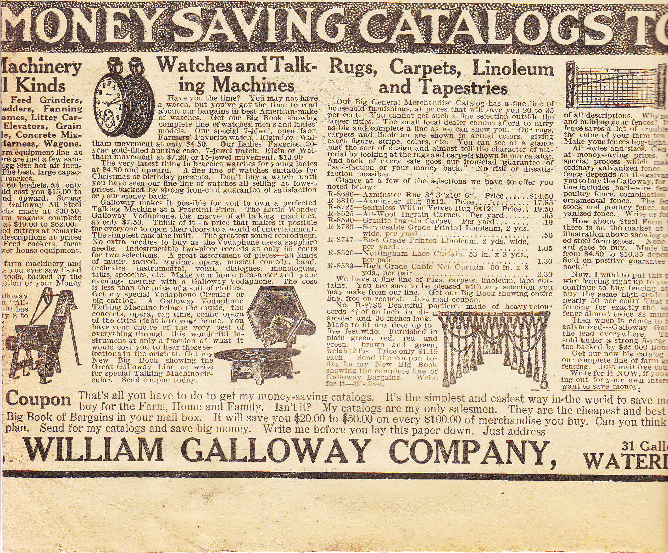 The phonograph was offered by the William Galloway Company of Waterloo, Iowa, a large mail-order company providing farm implements to midwestern farmers